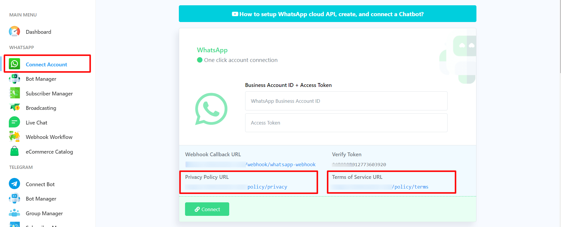 To get the callback URL and verify the token from Botkey. Login to your account and go to the dashboard of Botkey. At the left sidebar of the Dashboard, under the WhatsApp section, you will see connect WhatsApp option. Now click on the connect WhatsApp menu and instantly, Connect WhatsApp Business page will appear.